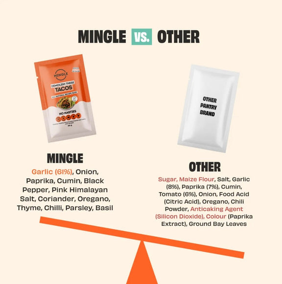 Mingle's Recipe Bases redefine healthy eating, offering delicious meals like tacos and curries in under 30 minutes. These gluten-free, plant-based, and lower-sodium blends are packed with all-natural spices, making healthy, mouth-watering meals incredibly easy.