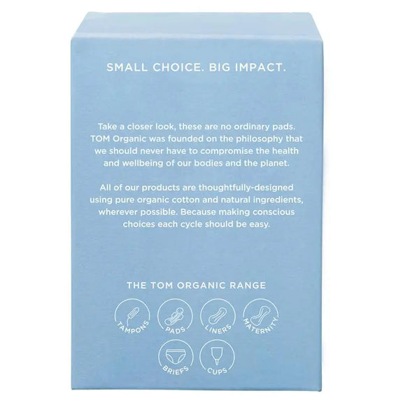 Discover the essence of mindful menstruation with TOM Organic Regular Pads. Made from 100% organic cotton topsheet, these ultra-thin, biodegradable materials pads are perfect for women and teens seeking a harmonious balance between comfort and sustainability. Ideal for regular to heavy flow, they provide reliable protection without harsh chemicals. Clinically tested for sensitive skin, our pads are hypoallergenic and free from chlorine bleach, dioxins, fragrances and dyes, ensuring your health and well-being are never compromised. Our unique design features wings for a secure fit and a plant-based core for exceptional absorbency, ensuring you stay confident and comfortable. When you choose TOM Organic, you're not just buying period wear, you're becoming part of a movement towards conscious living and menstrual care that respects both your body and the environment. Our TOM Organic Regular Pads are carefully packaged in recyclable cardboard, with individual wrappers made from siliconized PE film and bio-plastic. This sustainable approach minimizes the impact on the environment and ensures that our packaging is as conscious and eco-friendly as the pads themselves. Small Choice. Big Impact.