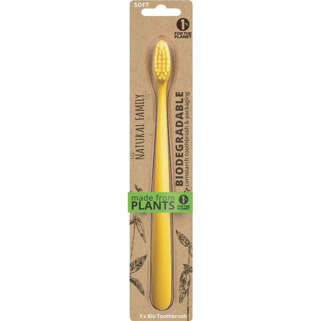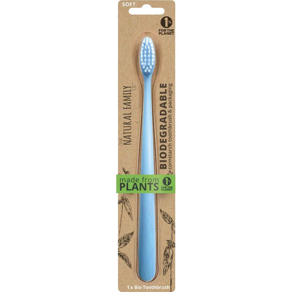 The NFCO Bio Tooth brush is biodegradable along with its packaging. The handle is made from non-GMO cornstarch with PBT bristles which are BPA free and recyclable.